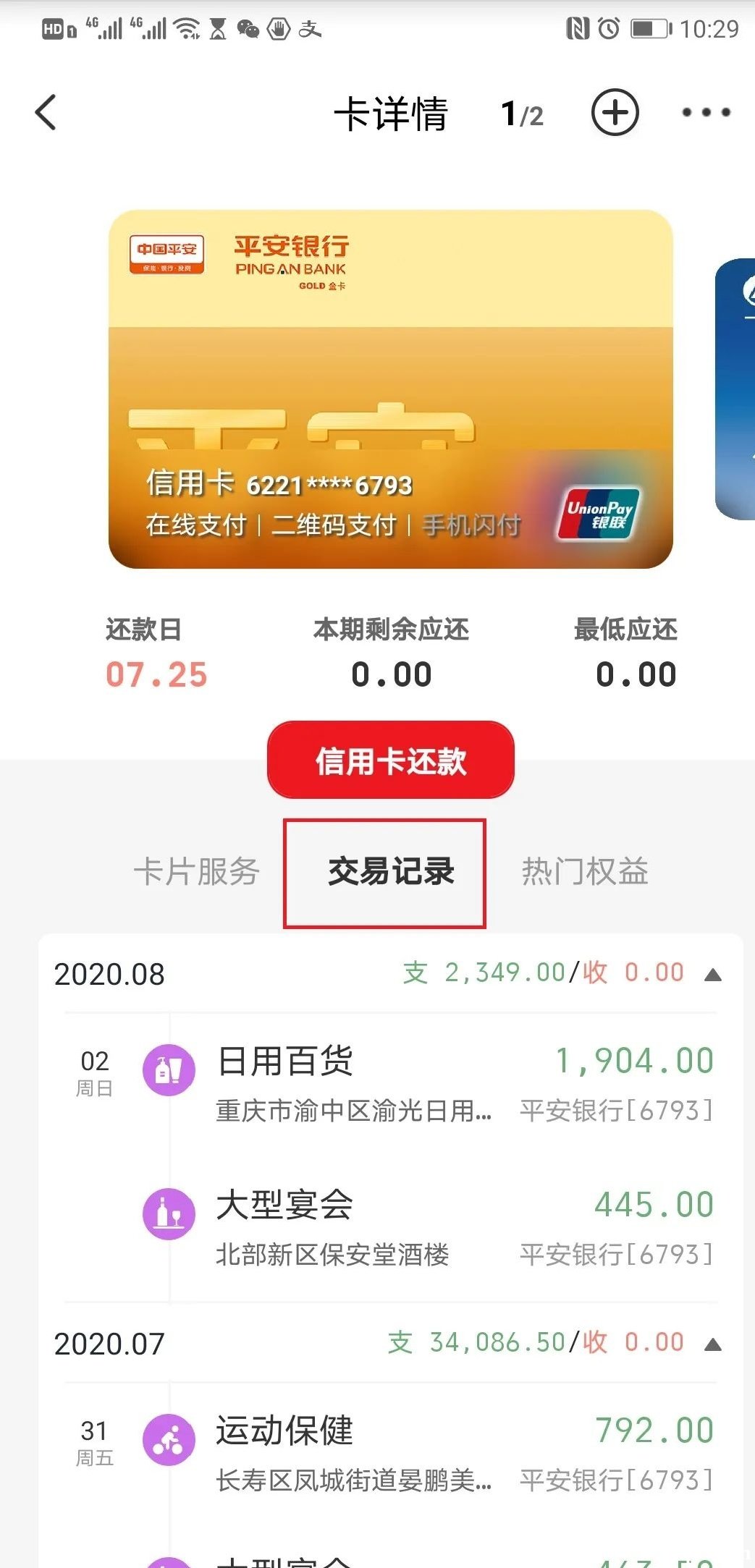 3、選擇綁定的信用卡,點(diǎn)擊【交易記錄】,可向上滑動,查看詳細(xì)的交易記錄;