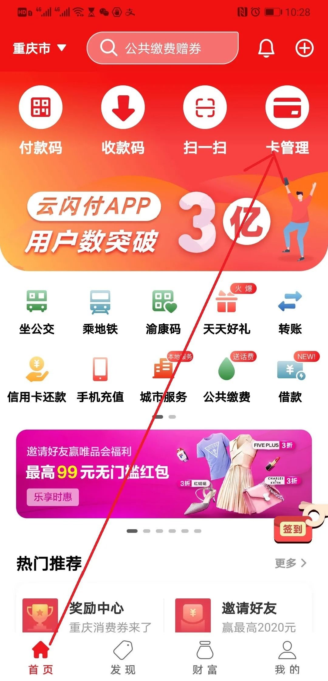 2、然后,注冊登錄云閃付APP,實(shí)名,并點(diǎn)擊首頁右上角的【卡管理】綁定信用卡;